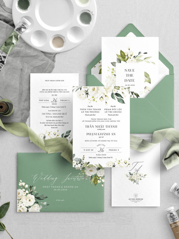 Thiệp cưới Hoa vẽ Màu Nước tông Trắng và Xanh Lá nhẹ nhàng