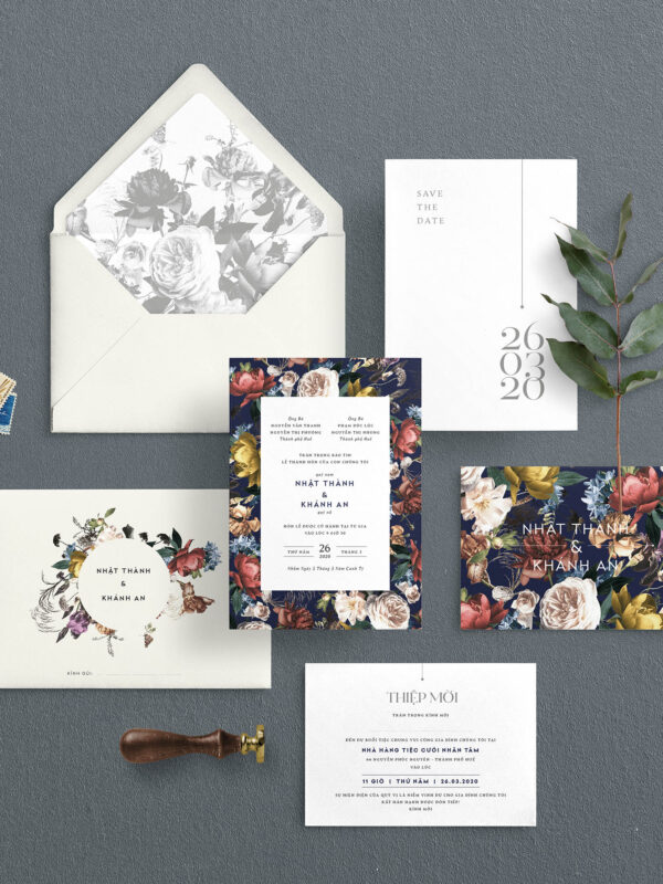 Thiệp cưới hoa | Nền xanh dương đậm | Phong bì kem